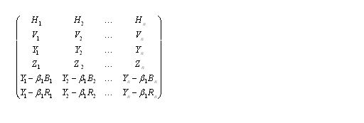 現(xiàn)行的彩色電視系統(tǒng)中,由行向量H,幀向量V,亮度向量Y組成的,表達(dá)彩色信息的是由紅向量R,綠向量G,蘭向量B的三維線性空間。也可用以下的矩陣來表示: