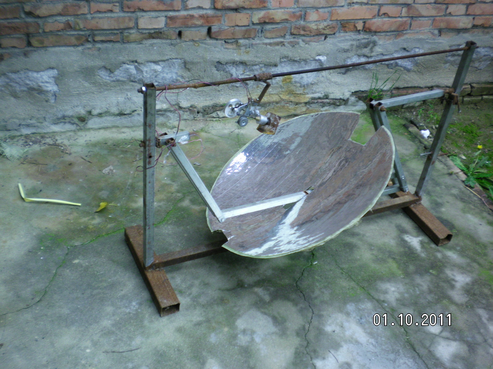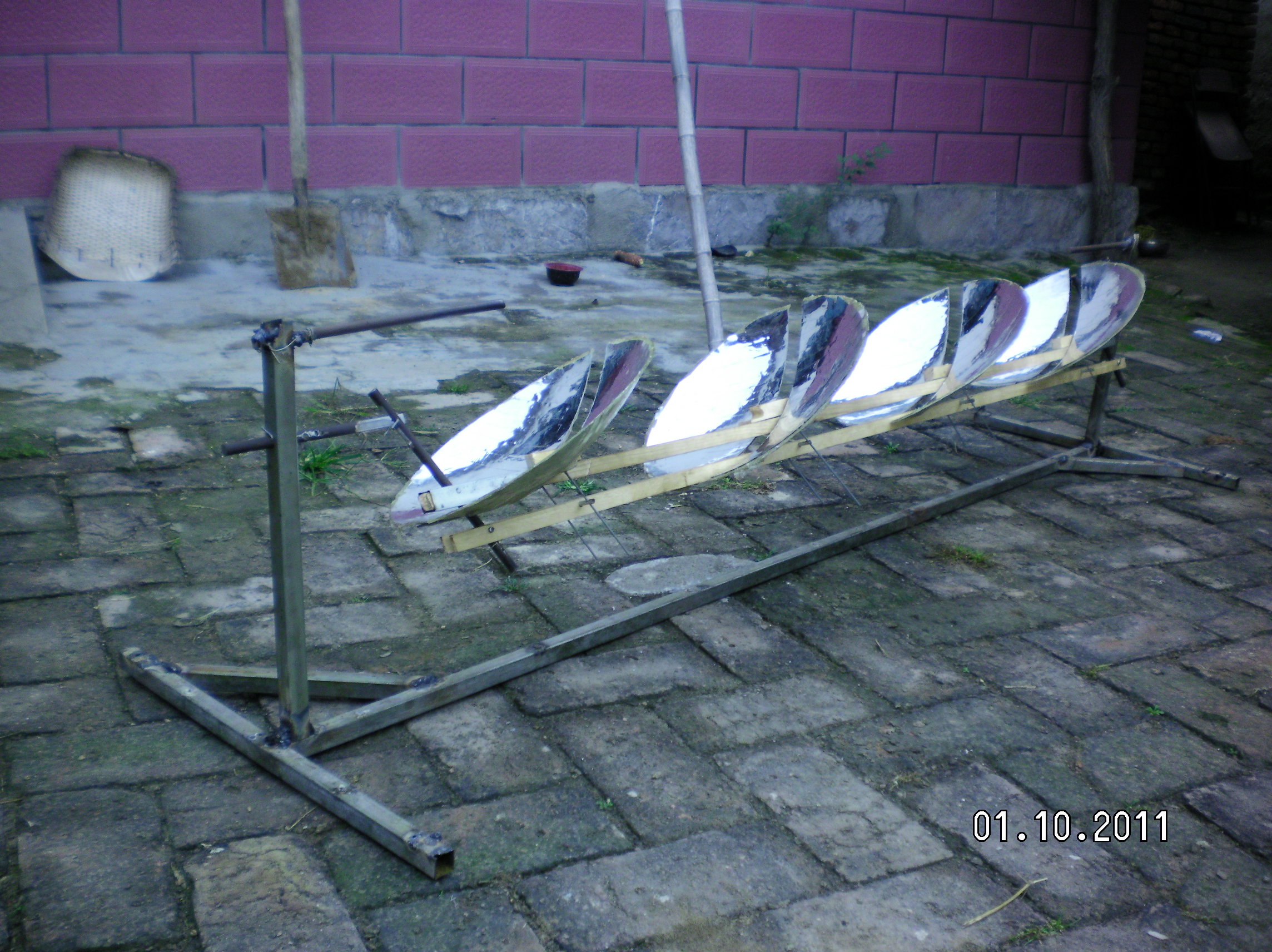 隨著全球環(huán)境惡化和日益嚴(yán)峻的能源形勢(shì)世界各國(guó)對(duì)太陽(yáng)能熱發(fā)電越來(lái)越重視?,F(xiàn)在最常用的太陽(yáng)能熱發(fā)電系統(tǒng)主要有槽式、蝶式和塔式,槽式和蝶式的光熱部件必須隨聚光鏡做相應(yīng)的運(yùn)動(dòng),槽式各個(gè)光熱部件復(fù)雜昂貴,蝶式光熱部分只能單獨(dú)使用塔式的受熱部分出現(xiàn)故障很難維修這三種系統(tǒng)都有自己的缺點(diǎn)?;诖宋以O(shè)計(jì)了平行定焦太陽(yáng)能聚光集熱發(fā)電系統(tǒng):主要有一對(duì)支柱.一對(duì)轉(zhuǎn)軸.一對(duì)動(dòng)臂.旋轉(zhuǎn)拋物面聚光鏡.一根托桿.一根平行桿.平行連桿組成將兩支柱固定在一條直線上,兩轉(zhuǎn)軸安裝在兩支柱上兩轉(zhuǎn)軸可以左右轉(zhuǎn)動(dòng),兩動(dòng)臂安裝在兩轉(zhuǎn)軸上使可以隨轉(zhuǎn)軸左右前后擺動(dòng)。托桿安裝在兩動(dòng)臂上,平行桿與托桿平行安裝在兩動(dòng)臂上,這樣動(dòng)臂.托桿.平行桿構(gòu)成一個(gè)平行凹框。在旋轉(zhuǎn)拋物面鏡原點(diǎn)安一橫軸并切去部分旋轉(zhuǎn)拋物面鏡,在橫軸兩端垂直安裝兩根平行連桿,把旋轉(zhuǎn)拋物面鏡的橫軸安裝在托桿上。在平行桿上安裝連桿軸把平行連桿與連桿軸連接在一起。所述旋轉(zhuǎn)拋物面鏡的焦距等于托桿與轉(zhuǎn)軸之間動(dòng)臂的長(zhǎng)度。將動(dòng)臂對(duì)準(zhǔn)太陽(yáng)陽(yáng)光就會(huì)聚焦到固定點(diǎn)上在這些位置安裝光熱部件就會(huì)得到熱能用于熱發(fā)電。這種結(jié)構(gòu)是雙軸定焦所以效率很高,抗風(fēng)性好。這種結(jié)構(gòu)可以做成很小裝在高在15-20cm的透明罩內(nèi)安裝在樓頂或樓房南墻上,為人們提供開(kāi)水或蒸汽。請(qǐng)看模型照片:
