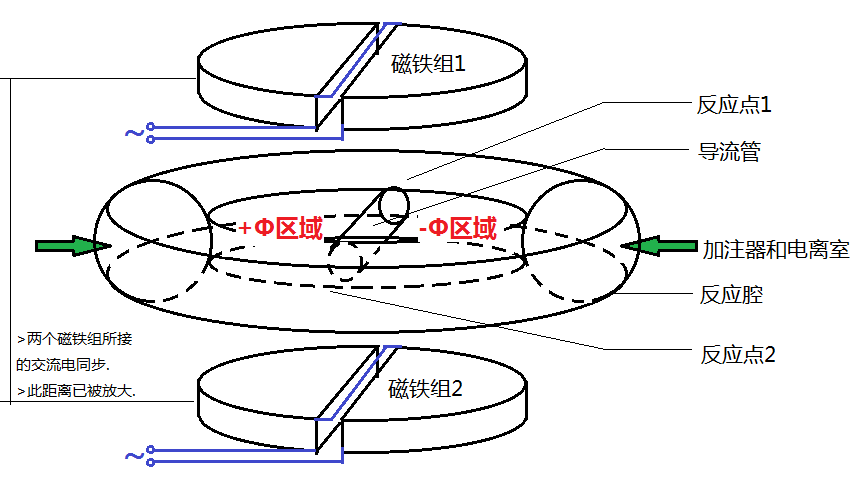 如圖, 兩組電磁鐵平行放置, 反應(yīng)腔夾于磁鐵之間. 每個(gè)電磁鐵組水平均分為兩半, 中間以狹縫隔開. 其線圈繞組使得在通交流電時(shí)兩半的磁場方向相反, 大小相同. 兩組電磁鐵通以同步高頻交流電, 于是就可以使兩組電磁鐵之間的半邊磁通量變化, 從而在反應(yīng)腔所在的位置產(chǎn)生渦旋電場. 兩邊的渦旋電場在反應(yīng)腔中部橫穿的導(dǎo)流管處疊加. 導(dǎo)流管兩端自然產(chǎn)生主、副對撞點(diǎn), 即反應(yīng)點(diǎn)1和2. 反應(yīng)腔內(nèi)同時(shí)還存在水平方向同軸的環(huán)形磁場(此點(diǎn)與托卡馬克相同), 用于約束粒子沿環(huán)形軌跡運(yùn)動(dòng), 并在反應(yīng)點(diǎn)處收緊以壓縮等離子體.