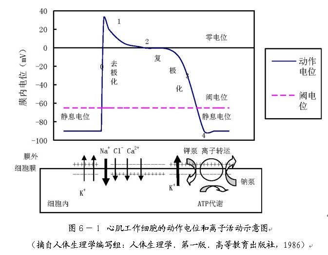 在上圖中,去極化(0期),心肌細(xì)胞受刺激后,靜息電位到達(dá)閾電位時(shí),迅速激活鈉通道,使其開放,造成大量鈉離子內(nèi)流,動(dòng)作電位迅速升高,鈉通道又迅速失活關(guān)閉;快速?gòu)?fù)極化初期(1期),鈉離子內(nèi)流停止,氯離子通透性升高,氯離子內(nèi)流,氯離子通道通透性也迅速下降;緩慢復(fù)極化期(2期),鈣離子緩慢內(nèi)流,與此同時(shí),少量鉀離子外流,鈣離子通道的激活和失活過程均緩慢,故稱慢通道;快速?gòu)?fù)極化末期(3期),鉀離子外流;靜息期(4期),此期離子轉(zhuǎn)運(yùn)活躍,即把動(dòng)作電位形成期間流入膜內(nèi)的鈉離子,氯離子,鈣離子排出,又把外流的鉀離子攝回,這一過程通過心肌細(xì)胞膜上的Na+-K+泵的作用完成的,需要消耗ATP的生理過程。(本小節(jié)內(nèi)容摘自人體生理學(xué)編寫組:人體生理學(xué).第一版.高等教育出版社,1986)