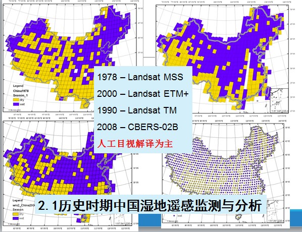 歷史時期中國濕地監(jiān)測與變化分析,因?yàn)闈竦貜?fù)雜性太難了,但是當(dāng)時已經(jīng)具備了所有遙感數(shù)據(jù),70年代的MSS,能全部覆蓋一次衛(wèi)星數(shù)據(jù)的,這是1978年MSS數(shù)據(jù),到了2000年,1990年,到了2008年我們用中巴衛(wèi)星數(shù)據(jù)做了研究,每期我們都出了大量的數(shù)據(jù),我們只想了解一下我們國家的濕地情況,就用最笨的方法人工目視解譯,做了大概3年時間,前后投入60、70個人做完這項(xiàng)工作,基本上對咱們國家濕地現(xiàn)狀有一個初步的了解。
