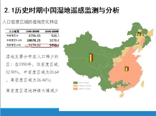 看看結(jié)果動態(tài)圖,每年的變化,1978年、1990年、2000年、2008年 Nature的有個記者說中國第一次完成了實(shí)驗(yàn),我們當(dāng)時完成了的時候是第二個完成的,除此之外,大家對濕地關(guān)注很多都是關(guān)注在特定的濕地研究,研究非常的細(xì)致,當(dāng)時從總體概貌來說這個工作是非常非常繁雜的工作。當(dāng)時我們做出來之后大家反響比較大。