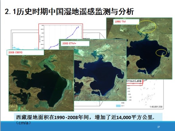 如圖所示,我們用了GLAS數(shù)據(jù),測試高層數(shù)據(jù)反應(yīng)了水面高層,反應(yīng)湖水容納變化。這是青藏高原的輪廓,冰川融水非常的多,原來納木錯是最大的,現(xiàn)在色林錯最大,20年前西藏濕地增加1萬多平方公里。