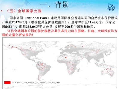 保護(hù)區(qū)評價,目前開展的是全球國家公園保護(hù)現(xiàn)狀和生態(tài)壓力評估正在做工作,首先為什么要干這項(xiàng)工作,加強(qiáng)國家公園保護(hù)狀態(tài)和生態(tài)壓力定量化評估,有助于人類了解地球上最美麗的生態(tài)環(huán)境資源的性質(zhì)和數(shù)量以及人類自身對這些資源產(chǎn)生了什么的壓力,有助于提高人類關(guān)于自然保護(hù)與持續(xù)發(fā)展的科學(xué)認(rèn)識和面對生態(tài)環(huán)境退化的應(yīng)對能力。有助于提升我國在世界上生態(tài)環(huán)境保護(hù)的地位和話語權(quán)。有助于提升我國在全球國家公園建設(shè)、生態(tài)安全維護(hù)和“一帶一路”戰(zhàn)略布局都具有重要的參考價值。通過研究世界上最好的范例,對中國國家公園體制改革試點(diǎn)、中國國家公園建設(shè)彎道超車和中國保護(hù)區(qū)事業(yè)健康發(fā)展均具有一定的借鑒意義。