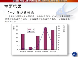 這是《科學(xué)通報》的封面,雙語的。下面簡單匯報一下評估結(jié)果,中國91個國家級濕地保護(hù)區(qū),總面積為 26.38萬km2,占全國國家級保護(hù)區(qū)總面積的 29% ;占全國保護(hù)區(qū)總面積的 18% ;占我國國土面積的 2.5% 。類型來看,沼澤濕地保護(hù)區(qū)最多,其次野生動物保護(hù)區(qū),第三個是海洋類型,河流類型最少的。