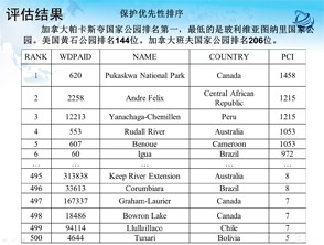 如圖所示,最后一排PCI的值最高達(dá)到1000多,最少只有5,加拿大帕卡斯夸國家公園排名第一,最低的是玻利維亞圖納里國家公園。美國黃石公園排名144位。加拿大班夫國家公園排名206位。
