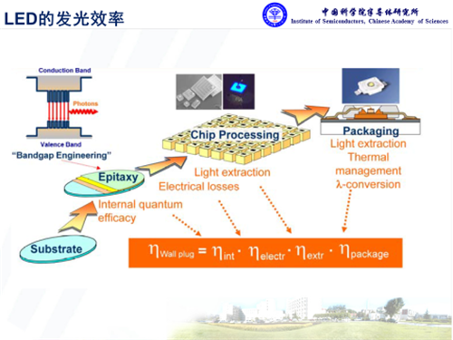 氮化鎵是直接帶隙的半導(dǎo)體材料,在光電應(yīng)用方面具有獨(dú)特優(yōu)勢(shì)。基于氮化鎵的HB-LED對(duì)于通用照明來說,其核心問題是發(fā)光效率。其中外量子效率主要取決于三個(gè)層面的因素,內(nèi)量子效率、光提取效率,還有封裝方面的熒光轉(zhuǎn)化等效率,而且每個(gè)環(huán)節(jié)都息息相關(guān)。