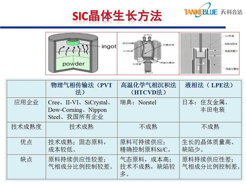 碳化硅襯底的生長方法有三種:一是物理氣相傳輸法,該技術(shù)相對(duì)成熟,性價(jià)比高;二是高溫化學(xué)氣相沉積法,優(yōu)點(diǎn)是原料可持續(xù)供應(yīng),可精確控制原料中的碳硅比;三是液相法,尚處于研究階段。