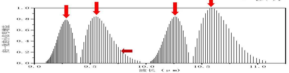 通常CO2激光器波長是10.59mm,這只是CO2激光增益譜中最強(qiáng)的一條譜線。從圖2-3 CO2激光器的譜線圖中可以看出,實際上有四條譜線的增益都比較大,分別為10.59mm、10.25mm、9.55mm及9.27mm。以上四條譜線為各支的強(qiáng)線。但是在很多應(yīng)用需求中,除輸出這四條強(qiáng)線外還要求輸出某些增益很低的弱線,且實際應(yīng)用中還需要很高的光束質(zhì)量,因此有較大的研制難度。