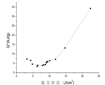 如圖3-5所示,單位面積除漆質(zhì)量先是隨著能量密度上升,在能量密度為6~8 J/cm2之間達(dá)到峰值,隨后下降。當(dāng)激光能量密度大于12 J/cm2后,單位面積除漆質(zhì)量顯著下降,此時,激光與樣品表面的作用機(jī)理可能已發(fā)生突變。而進(jìn)一步分析Q*值(Q*=激光能量密度/單位面積除漆質(zhì)量)隨能量密度的變化曲線,如圖3-6所示??梢钥闯觯?dāng)能量密度大于10 J/cm2后,Q*值隨著激光能量密度的提高大幅提高,說明激光能量的利用效率顯著下降。且在入射激光能量密度為6.5 J/cm2時,Q*值為極小值,約為3 kJ/g。