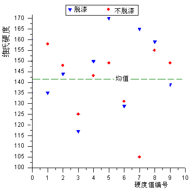 最后采用顯微硬度計,測量樣品除漆前后的維氏硬度(HV)。測量結(jié)果如圖3-7所示,可以發(fā)現(xiàn),在高于均值的樣品中,除漆的有5個,未除漆的有6個,并且分布表現(xiàn)出無規(guī)律性,所以飛機(jī)蒙皮經(jīng)過激光除漆后維氏硬度并沒有明顯差別。