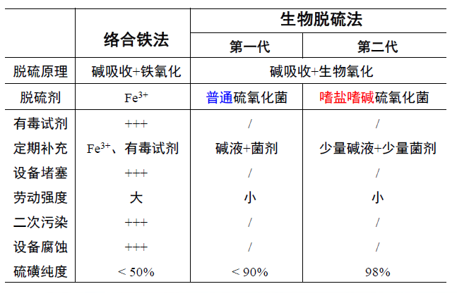 經(jīng)過中試連續(xù)運行我們發(fā)現(xiàn)嗜鹽嗜堿硫氧化脫硫體系相比傳統(tǒng)絡(luò)合鐵法具有明顯的優(yōu)勢:極端微生物可耐受的環(huán)境優(yōu)勢更為突出,僅需定期補充堿液及少量菌劑就可保證整個系統(tǒng)連續(xù)運轉(zhuǎn),勞動強度小,且系統(tǒng)回收單質(zhì)硫磺的純度高達(dá)98%。更多內(nèi)容見下表。
