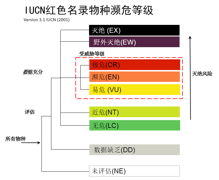 IUCN自20世紀(jì)60年代成立之日起,就設(shè)立了物種生存委員會(huì)(SSC),開始編制和印刷《IUCN瀕危物種紅皮書》,后來隨著評(píng)估物種的增加,印刷版逐步發(fā)展為網(wǎng)絡(luò)版的《IUCN瀕危物種紅色名錄》,定期編制發(fā)布。IUCN/SSC研究制定了《IUCN物種紅色名錄瀕危等級(jí)和標(biāo)準(zhǔn)》,根據(jù)物種的種群數(shù)量和分布情況等,評(píng)估其生存狀況,確定其瀕危等級(jí)。IUCN瀕危物種等級(jí)標(biāo)準(zhǔn)分為“有評(píng)估數(shù)據(jù)”和“數(shù)據(jù)缺乏”兩類,“有數(shù)據(jù)評(píng)估”中又分為“滅絕”、“野外滅絕”、“區(qū)域滅絕”、“極危”、“瀕?!?、“易?!?、“近危”和“無?!钡?個(gè)級(jí)別,從“無?!钡健皹O?!?,滅絕風(fēng)險(xiǎn)逐步上升,瀕危等級(jí)逐步增加。瀕危等級(jí)標(biāo)準(zhǔn)有5個(gè)指標(biāo),分別是種群下降、有限地理分布區(qū)、下降小種群、非常小或非常有限的種群、以及模型模擬等量化分析,根據(jù)這些指標(biāo)的數(shù)量閾值,來評(píng)估物種的瀕危等級(jí)。