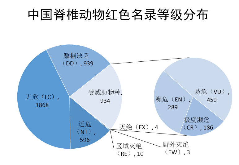 2015年完成的《中國(guó)生物多樣性紅色名錄-脊椎動(dòng)物卷》,共評(píng)估了中國(guó)4357種脊椎動(dòng)物,包括673種哺乳類,1372種鳥類,461種爬行類,408種兩棲類,1443種淡水魚類。其中939種數(shù)據(jù)缺乏,1868種無危,596種近危,受威脅的物種共934種。在934種受威脅物種當(dāng)中,易危459種,瀕危289種,極度瀕危186種。受威脅的原因分析中,過度利用、生境喪失和人類干擾是最主要的威脅因子。