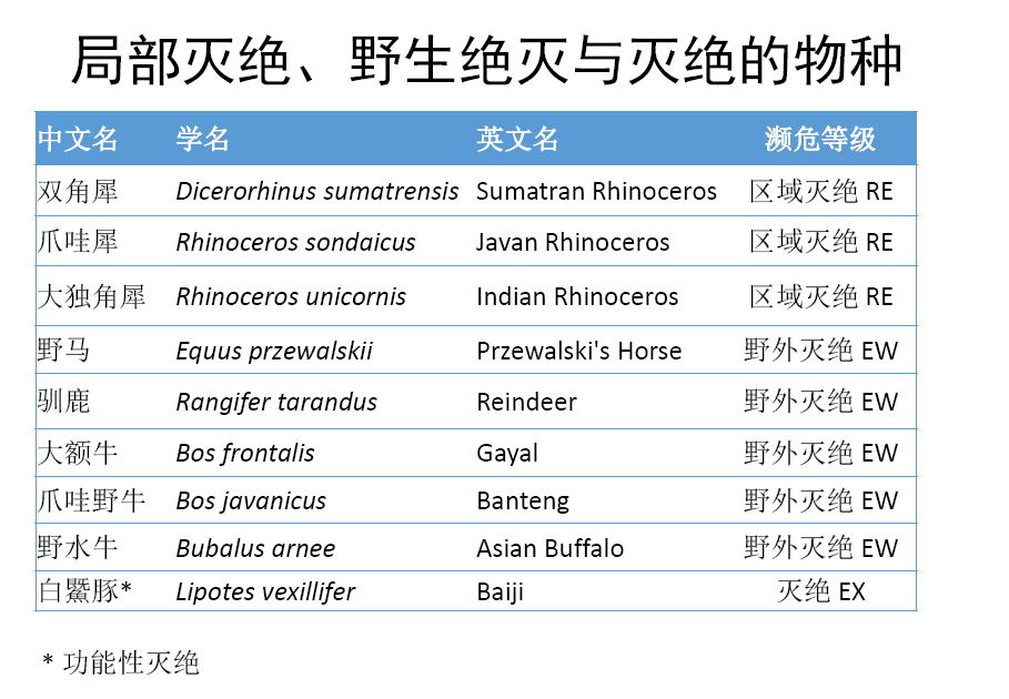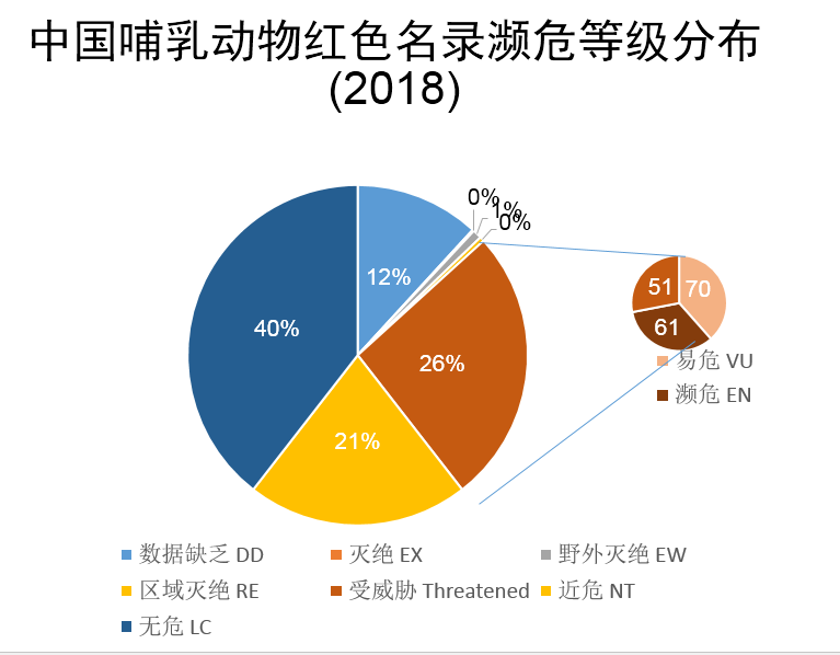 此外,我們對(duì)中國(guó)哺乳動(dòng)物多樣性進(jìn)行編目,分別于2015年和2017年完成了第一版和第二版,第一版中,我們收錄了673種哺乳動(dòng)物,第二版中我們刪除了一些不存在的物種如倭巖羊,并增添了一些物種,主要是分布在藏南的一些物種,共收錄了693種哺乳動(dòng)物,使得我國(guó)的哺乳動(dòng)物總數(shù)位列全球首位。2015年發(fā)布《中國(guó)生物多樣性紅色名錄-脊椎動(dòng)物卷》后,2018年又對(duì)該紅色名錄等級(jí)進(jìn)行了更新,哺乳動(dòng)物的情況來看,最新的評(píng)估結(jié)果中,受威脅的物種占26%、近危21%,無危40%,數(shù)據(jù)缺乏12%,其中有多個(gè)物種已經(jīng)區(qū)域滅絕、野外滅絕或功能性滅絕。部分中國(guó)特有的哺乳動(dòng)物,中國(guó)生物多樣性紅色名錄和IUCN紅色名錄的評(píng)估結(jié)果,由于評(píng)估信息的不同,結(jié)果也有所不同,如白鱀豚、長(zhǎng)江江豚等;還有一些哺乳動(dòng)物由于并非中國(guó)特有,所以中國(guó)生物多樣性紅色名錄和IUCN紅色名錄評(píng)估等級(jí)有所不同,如野馬、賽加羚羊、麋鹿、蒙原羚、河貍等。