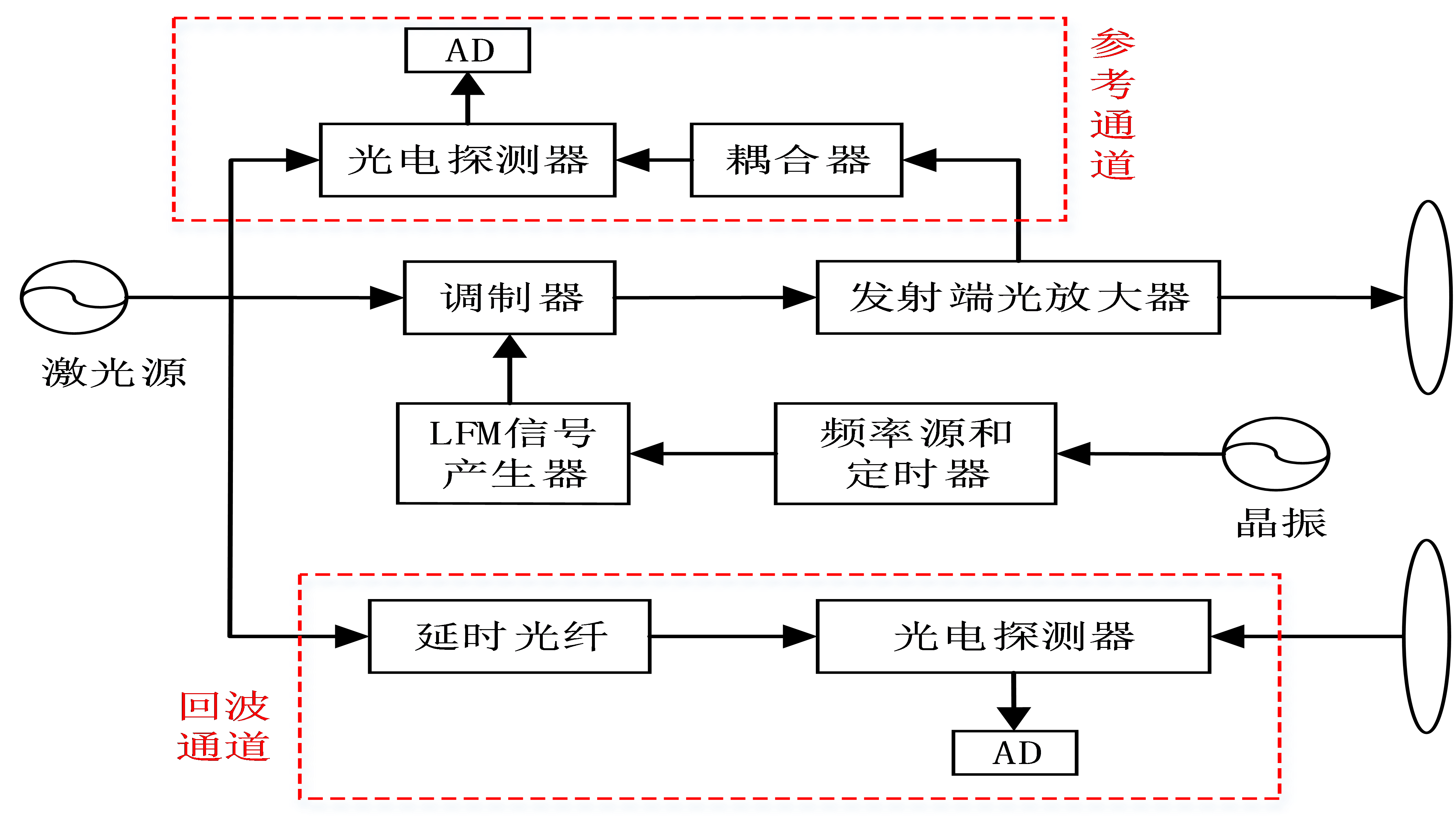 設(shè)置發(fā)射信號(hào)參考通道對其非線性失真相位實(shí)施定標(biāo)校正,以及通過本振延時(shí)光纖實(shí)現(xiàn)信號(hào)相干性保持方法如圖2所示。