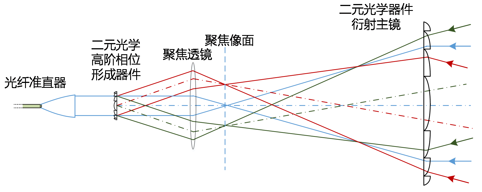 一個(gè)在壓縮光路中饋源和主鏡兩處使用二元光學(xué)器件的機(jī)載SAL衍射光學(xué)系統(tǒng)如圖4所示。