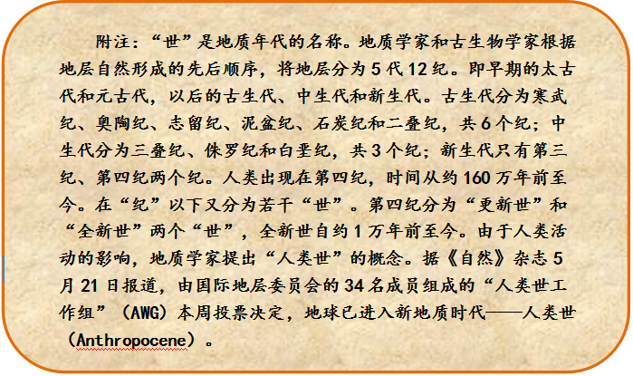 在2000年的一個(gè)國際會(huì)議上,1995年諾貝爾化學(xué)獎(jiǎng)得主保羅-克魯岑提出,當(dāng)今人類活動(dòng)對自然環(huán)境的影響已經(jīng)超過了自然狀態(tài)的變化,應(yīng)該定義一個(gè)新的地質(zhì)時(shí)代,叫人類世。我國科學(xué)家劉東生院士參加了此會(huì),回國后就極力推薦這個(gè)詞。