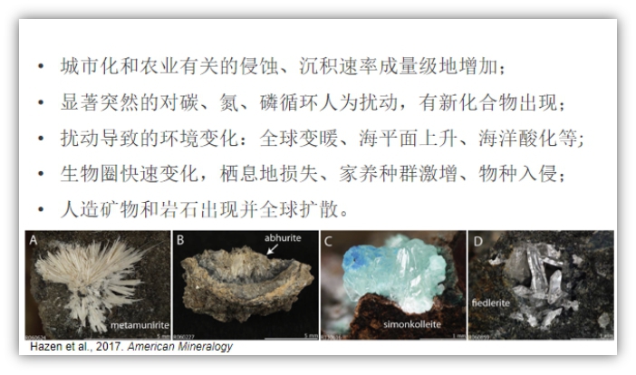 國際地層委員會(huì)的人類世工作組工作了10年,總結(jié)了一些現(xiàn)象,如城市化和農(nóng)業(yè)的侵蝕、沉積速率成量級地增加,顯著而突然的對碳、氮、磷循環(huán)的人為擾動(dòng),產(chǎn)生一些新的化合物,使得生物圈出現(xiàn)快速變化、棲息地的損失帶來植物多樣性的降低、馴化生物種群大規(guī)模增加,人類的遷徙活動(dòng)等等。