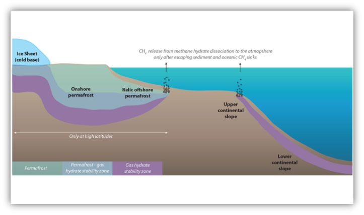 全球變暖,海洋中,深度在2000米以內(nèi)的海水升溫,將導(dǎo)致在陸坡上存在的可燃冰(固態(tài)甲烷水合物)釋放,空氣中的甲烷會(huì)迅速氧化成二氧化碳,使二氧化碳濃度急劇增加。