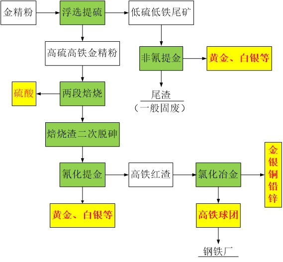 我們提出了黃金未來發(fā)展的一個思路。黃金綠色選冶技術(shù)包括以下三個部分:難選冶金精粉硫鐵富集選、兩段焙燒?氰化提金(含焙燒渣二次脫砷)、高鐵紅渣高值化綜合利用、尾礦非氰提金。終端產(chǎn)品包括金、銀等貴金屬、硫酸、銅、高品質(zhì)煉鋼粒鐵(球團)等。該流程產(chǎn)業(yè)鏈結(jié)構(gòu)完整,實現(xiàn)真正意義上的資源循環(huán)利用;綜合回收礦物中的金、銀、銅、鉛、鋅等有色金屬和鐵,各有價元素的資源化利用得到最大化,避免了資源浪費;實現(xiàn)了氰化尾渣的無害化利用,整個過程沒有危險固廢產(chǎn)生,廢氣達標排放,水循環(huán)使用無外排;能夠處理多元素含砷復雜金精礦,對原料的適用性強(圖4)。