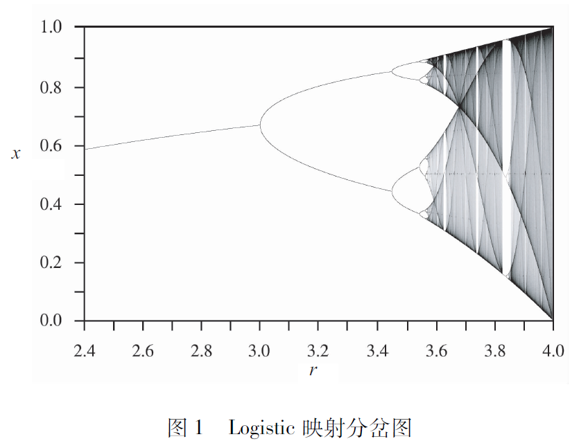 例如,當r=2.5時,Logistic映射的穩(wěn)態(tài)很簡單,就是一個不動點,也稱為周期一點。如果:再增加,比如增加到2. 9,這時穩(wěn)態(tài)依然還是個不動點,和r=2.5時的穩(wěn)態(tài)對比,穩(wěn)態(tài)行為并沒發(fā)生性質(zhì)的變化。進一步增加到3. 0時,會發(fā)現(xiàn)穩(wěn)態(tài)還是個不動點,但這時候與2. 9時有一點變化,這時映射處于一種臨界狀態(tài),如果參數(shù)r再增加一點就無法觀察到之前的不動點穩(wěn)態(tài)行為,所以我們認為在r=3.0處Logistic映射發(fā)生了分岔現(xiàn)象。進一步增加參數(shù)r到3. 1時,就會發(fā)現(xiàn)穩(wěn)態(tài)已經(jīng)不是不動點或周期一,而是周期二了。周期二就是指穩(wěn)態(tài)行為在兩個點之間來回的振蕩。進一步增加r到3. 45時,映射又進人了周期二的臨界狀態(tài),當然我們認為這時也發(fā)生了分岔現(xiàn)象。進一步增加r我們還可以觀察到周期四穩(wěn)態(tài),即在這四個點之間來回振蕩形成一個完整的軌道。剛才我們已經(jīng)觀察到周期一到周期二的倍周期分岔以及周期二到周期四的倍周期分岔,隨著r繼續(xù)增加,我們還可以進一步地觀察到倍周期分岔,如周期四到周期八、周期八到周期十六、周期十六到周期三十二等等。顯然,隨著倍周期分岔的持續(xù)發(fā)展,映射穩(wěn)態(tài)將呈現(xiàn)越來越大的周期態(tài),這個周期態(tài)在極限情況下周期將無窮大,就變?yōu)榱艘粋€非周期行為,我們稱之為混沌態(tài),這就是非線性動力學中典型的倍周期分岔通向混沌的路徑。通過這個Logistic映射的例子,我們簡單地認識了一下什么是分岔。分岔其實從定義上來說很簡單,它就是指當系統(tǒng)參數(shù)改變時,動力學系統(tǒng)定性行為發(fā)生變化的一種現(xiàn)象。分岔描述的是系統(tǒng)隨參數(shù)變化的動態(tài)現(xiàn)象,不同類型的分岔其細節(jié)也不一樣,我們可以進一步地定義不同的分岔現(xiàn)象,因為時間原因這里就不給大家詳細展開了。