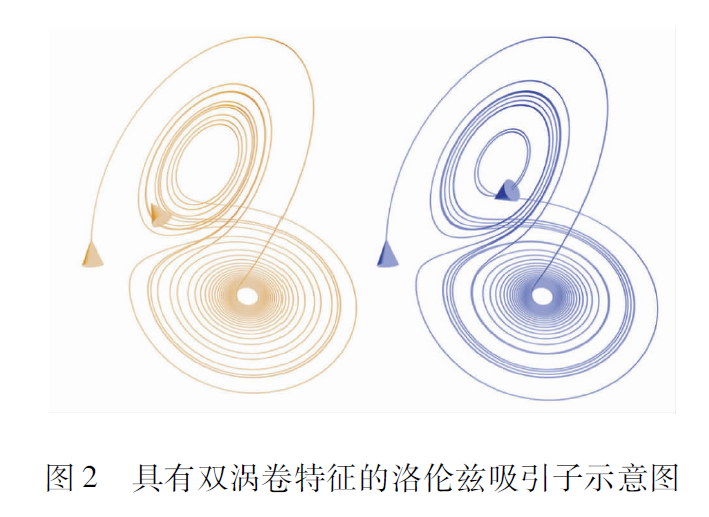 洛倫茲系統(tǒng)其實就是一個簡單的三維自治ODE方程組,洛倫茲發(fā)現(xiàn)在某些參數(shù)下該系統(tǒng)會出現(xiàn)混沌行為。圖2給出了洛倫茲系統(tǒng)具有雙渦卷特征的混沌吸引子相圖,注意其軌道是永不重復的。