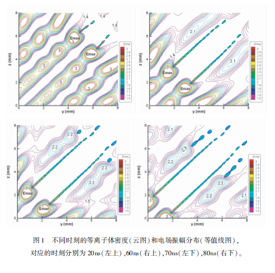 下面看一下相交微波束大氣擊穿的模擬結(jié)果,我們首先算了同頻率微波相交的情況,此時相干疊加之后,由于干涉作用,會形成電場強度強弱分布。我們首先模擬一下種子電子在弱場區(qū)的情況。因為在大氣中種子電子是偶然出現(xiàn)的,有可能出現(xiàn)弱場區(qū),如果出現(xiàn)在弱場區(qū),它需要擴散,擴散到強場區(qū)之后電子碰撞分子發(fā)生雪崩電離,形成的等離子體沿著強場區(qū)做趨源運動,運動方向沿著)=:的這條線。形成的等離子體的區(qū)域是一個等離子體絲帶,當然如果把氣壓降低,會發(fā)現(xiàn)絲帶就會過渡為一個等離子體帶。圖1給了幾個典型時刻的等離子體密度分布和場強的分布,在20ns的時候,由于靠近等離子體區(qū)域最強的場是沿著)=:這條線的,當?shù)入x子體絲帶長度增加到一定程度的時候,在其左上和右下區(qū)域,相當于把兩個微波場隔開,這兩個區(qū)域相當于只有一個單微波的作用,在兩邊有新的等離子體絲帶。如果初始電子出現(xiàn)在強場區(qū),電子碰撞分子就會雪崩電離,形成等離子體。等離子體區(qū)域也是沿著J=:這條線做趨源運動。下面簡單比較了同頻和非同頻微波相交的大氣擊穿,同頻相當于相干疊加,非同頻相當于非相干疊加,模擬時間都是80ns,初始的種子電子數(shù)都一樣,可以發(fā)現(xiàn)在相干的情況下,即使把種子電子源放到場強最小的地方,產(chǎn)生等離子體的區(qū)域也大于非相干的情況,而且產(chǎn)生的最大電子數(shù)也是大于非相干的情況??偨Y(jié)主要有三點,一個是區(qū)域隨壓強的變化,還有等離子體做趨源運動,還有相干比非相干的等離子體區(qū)域比較大。