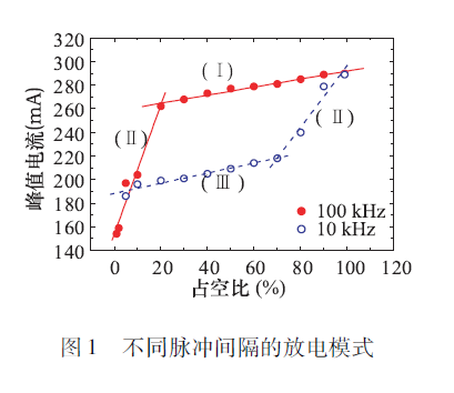 如果兩個脈沖間隔比較近,那么跟連續(xù)就沒什么差異,因為脈沖撤銷以后,即射頻消失以后,電極間還存在的空間電荷,也就是有電子和離子分離存在,這些電子在第二脈沖上來后就會參與放電,這時與連續(xù)放電差異性就不大了。如果脈沖間隔范圍足夠?qū)?,這就成為兩個不同的放電,兩個放電之間是不相關的。如圖1( I)是脈沖之間間隔非常小的時候,稱為連續(xù)模式;下面的Ⅲ是脈沖之間間隔非常大的時候,稱為分離模式,我們可以看到整個放電的峰值電流要小不少。在它們之間,(II)稱為傳輸模式,在兩個脈沖之間,電子沒有完全消亡的情況下放電電流與占空比的關系。共有上述三個過程,可見脈沖的間隔長短對放電的影響不是由占空比決定,主要是考慮電極之間間距和里面所參與的空間電荷分布變化。