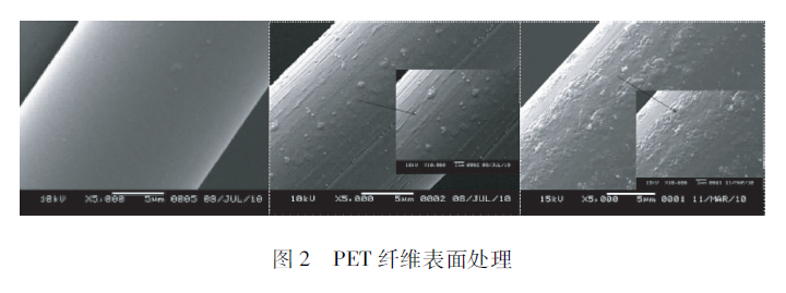 用長50cm、間距5cm的電極板做了一個射頻的放電模式。我們用上面介紹的JET做了滅菌實驗,細菌的存活數(shù)量得到了有效的下降。在這里主要看一下對化纖的處理效果,圖2的左圖是沒有處理過的,中圖是200 W處理的,右圖是800 W處理的。這兩個之間有什么區(qū)別呢?中圖顯示纖維表面有溝槽出來,這任何化纖在等離子體處理情況下刻蝕的一個特征,在低真空情況下的射頻放電都會有溝槽刻蝕出來。但是在大氣壓輝光放電的情況下,表面有許多圓形體產(chǎn)生。我認為不單純有刻蝕,而且有表面熔融的狀態(tài)出來。所以說,在大氣壓射頻放電對表面的作用是相當強的。雖然每個脈沖時間比較短,但是它的作用非常強。