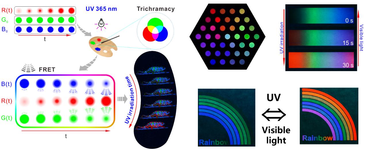 比如發(fā)光的防偽材料,利用纖維素均相可控反應(yīng)的優(yōu)勢,把原來容易聚在一起的熒光分子,通過化學(xué)方法鍵合到纖維素上,克服了溶液狀態(tài)下聚集誘導(dǎo)淬滅效應(yīng),將其制成固態(tài)熒光材料,同時它仍然具有高分子的可打印、可噴涂的特點,將不同的發(fā)光基團接到不同的纖維素上可以得到不同的顏色,將紅、綠和藍(lán)三種顏色的纖維素衍生物共混,利用三基色原理,還可以做打印的動態(tài)熒光材料(圖5)。