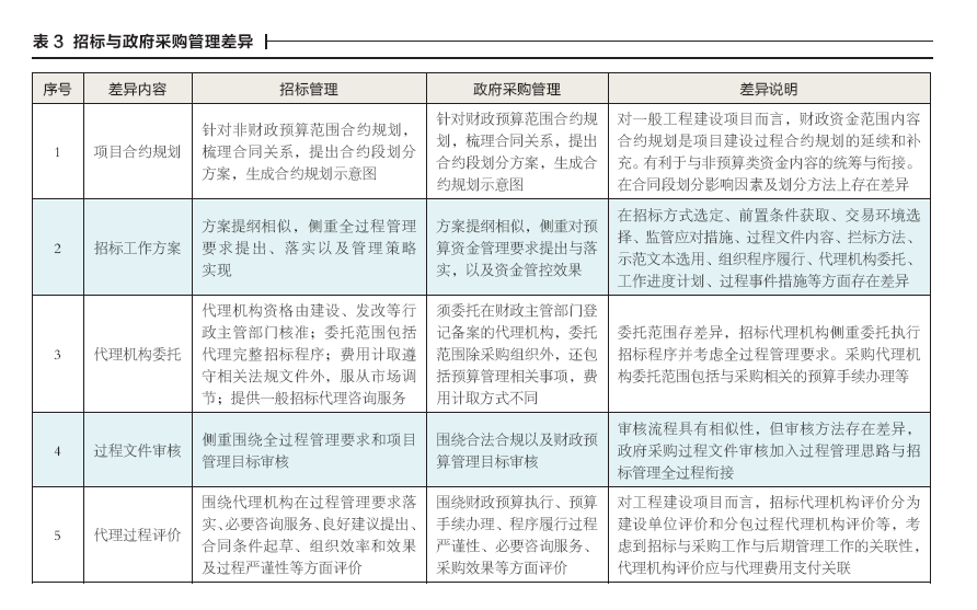 工程建設(shè)項(xiàng)目招標(biāo)管理是指站在建設(shè)全過程視角對(duì)招標(biāo)活動(dòng)實(shí)施的一系列管理工作。同理,政府采購(gòu)管理指采購(gòu)人針對(duì)擬組織實(shí)施的采購(gòu)活動(dòng)開展的一系列管理工作。政府采購(gòu)管理過程除遵循財(cái)政預(yù)算控制要求外,依然需將全過程思想貫穿始終。上述兩類活動(dòng)管理目標(biāo)均包括降低過程風(fēng)險(xiǎn)、提升交易效率、確保交易質(zhì)量、滿足全過程管理要求等。招投標(biāo)或政府采購(gòu)管理工作內(nèi)容均包括:合約規(guī)劃、工作方案編制、代理機(jī)構(gòu)委托、過程文件審核、招標(biāo)與采購(gòu)代理過程評(píng)價(jià)等方面。針對(duì)上述內(nèi)容,兩類活動(dòng)有關(guān)差異內(nèi)容詳見表3。